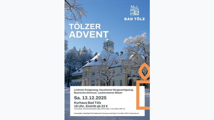 Mit dem Tölzer Advent lädt die Stadt Bad Tölz am 13.12. um 16 Uhr in das prächtige Kurhaus zu bayerischen Liedern und volksmusikalischen Klängen sowie besinnlichen Texten in der Adventszeit ein. Der renommierte Lindmair Dreigesang aus Fischbachau sowie der beliebte Haushamer Bergwachtgsang bringen stimmungsvolle Lieder zur Adventszeit mit, die von den Laubensteiner Bläsern aus dem Chiemgau und der Boarischen Almmusi aus dem bayerischen Voralpenland mit feinen Klängen und gefühlvollen Musikstücken bestens auf die Weihnachtszeit einstimmen. Der Tölzer Sprecher Klaus Wittmann findet mit seinen Texten besinnliche und vergnügliche Gedanken die freudig auf das Weihnachtsfest Ausschau halten.
