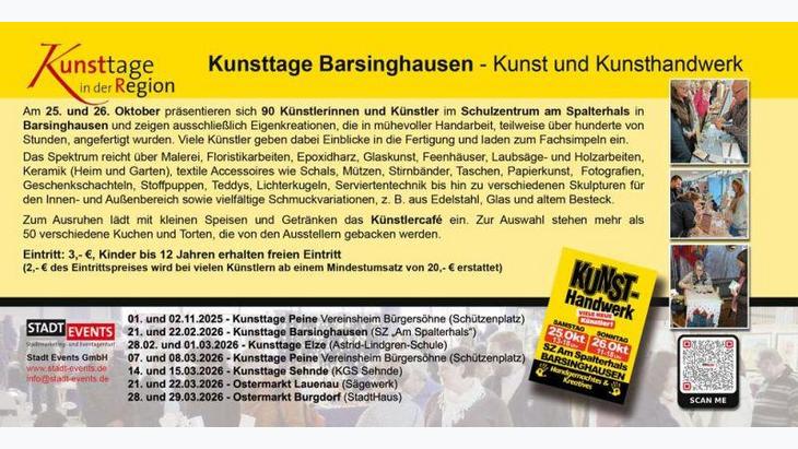 Bei der 23. Auflage der Kunsttage in Barsinghausen präsentieren sich am 25. und 26. Oktober wieder mehr als 90 Künstler auf einer der längsten Kunstmeilen in der Region Hannover im Schulzentrum "Am Spalterhals". Erlesenes und traditionelles Kunsthandwerk kombiniert mit trendigem Design machen diesen Markt zu einem Geheimtipp in der Region.
