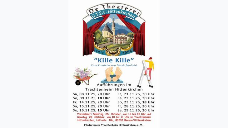 Wie im Vorjahr werden die Theaterer des Trachtenvereins „Almarausch” Hittenkirchen ihr neues Stück an insgesamt zehn Terminen im November, in ihrem Trachtenheim aufführen. Heuer steht die schwarzhumorige Komödie in drei Akten „Kille Kille“ des britischen Autors Derek Benfield auf dem Programm.