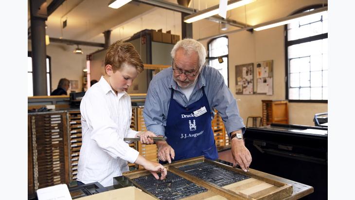 In der Buchdruckwerkstatt lüften Mitarbeiter des Museums oder ehemalige Setzer und Drucker die Geheimnisse der 'Schwarzen Kunst'. Von 14:00 - 15:00 Uhr. Ohne Anmeldung.
