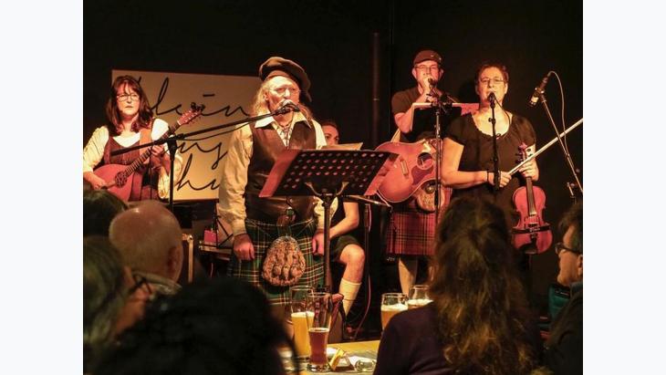 Sie dürfen auch getrost als echte „Rockband“ bezeichnet werden, denn als Hommage an irische und vor allem schottische Tradition tragen nicht nur die beiden Frauen Claudia (Banjo, Bouzouki & Gitarre) und Mai (Fiddle, Flute, Mandoline & Tin-Whistle) klassische Röcke, auch die drei Männer Jonny (Wooden Spoons, Percussion), Tom (Baß, Gitarre) und Valej (Bodhrán) zeigen sich auf, hinter und neben der Bühne in bunten Kilts mit typisch irischen (Tom & Valej) und schottischen (Jonny) Tartans.