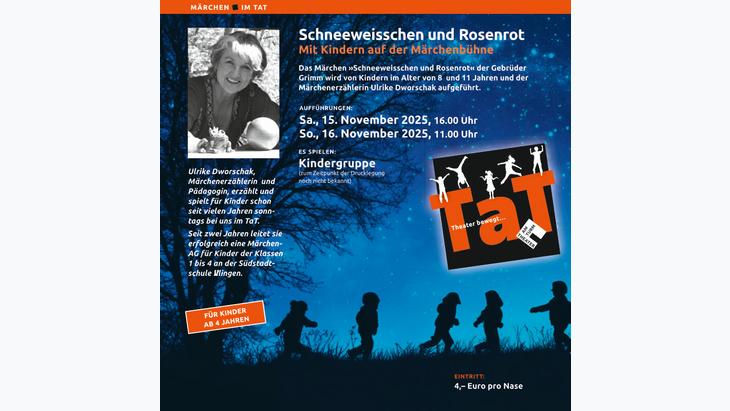Ulrike Dworschak, Märchenerzählerin und Pädagogin, erzählt und spielt für Kinder schon seit vielen Jahren sonntags bei uns im TaT. Seit zwei Jahren leitet sie erfolgreich eine Märchen-AG für Kinder der Klassen 1 bis 4 an der Südstadtschule Villingen.