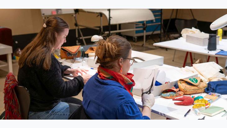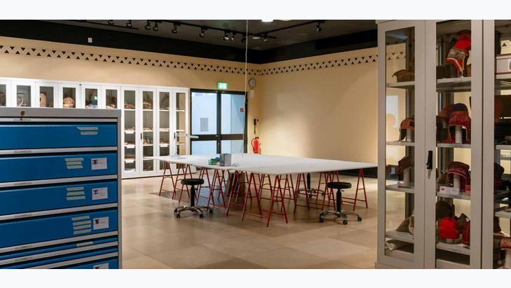 Für die Forschungsarbeit entstand eigens der Projektraum Áimmuin, was auf Nordsámisch bedeutet: bewahrt, an einem sicheren Ort, erreichbar, in der Nähe, noch in der Luft, nicht vergessen. Hierher zog die sámische Sammlung aus dem Depot um: Über 800 Objekte wurden dekontaminiert, teilweise restauriert und nach sámischen Kategorien in Studiensammlungsschränken neu geordnet. Die Forscher*innen und Kunsthandwerker*innen aus Sápmi erhalten in diesem Raum einen leichteren und direkteren Zugang zu den sonst im Depot verwahrten Objekten. In der hier geschaffenen geschützten Arbeitsumgebung können sie sich intensiv mit der Sammlung auseinandersetzen und zu eigenen Werken inspirieren lassen. Diese Werke entstehen gerade und werden ab 15. August – im Dialog mit der historischen Sammlung – in Áimmuin zu sehen sein. Für Besucher*innen werden damit auch erste Ergebnisse der Provenienzforschung erfahrbar, während die Arbeit im Projekt noch am Anfang steht und viele weitere Jahre der intensiven Auseinandersetzung benötigen wird.